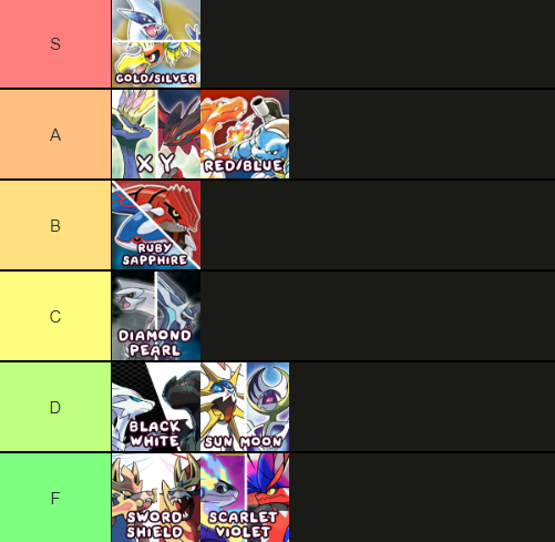 Shortly after getting into Pokemon through the TCG and anime, I was gifted a teal Gameboy Color and a copy of Pokemon Red Version. My reading comprehension wasn’t the best, but I still managed to finish the game after getting stuck a few times and basically only using my starter. After that, my Pokemon appreciation soared and I made sure to find a way to play each new generation before the next came out. And through the years of playing all of the games as they came out I mentally noted the quality of each game in order.