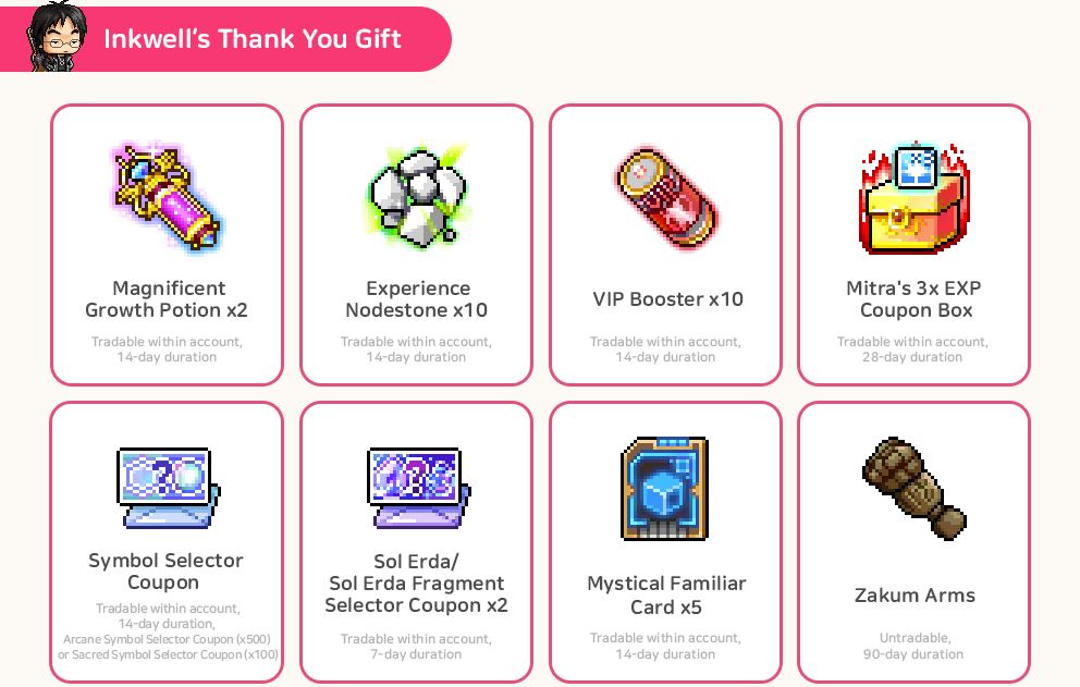 It’s not all doom and waiting though. Apparently with the release of GMS’ Milestone update (November 20, 2024) Team GMS has an exclusive event in store for western players and judging by the graphic above, perhaps it has something to do with Gollux? They didn’t share anything beyond that, but they plan to announce details of the Winter update at this year’s Maplefest on October 26th. Hopefully we’ll get more details then. In his closing statements Inkwell reflected on the state of GMS’ playerbase when he’d first arrived and how much morale has improved since his team started communicating better (FFS we’ve only been asking for this for 12 years…) and actually making changes. He gives appreciation for all of the players’ feedback and ends the newsletter by announcing a small in game gift for players who login from now until the 9th of October.